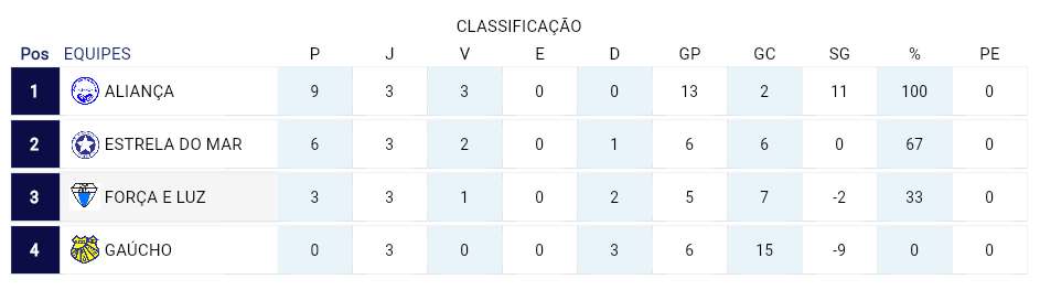 A equipe do Aliança mantém o ritmo forte no Campeonato Municipal, somando nove pontos e 100% de aproveitamento após três rodadas. Logo atrás aparece o Estrela do Mar, com seis pontos conquistados. O Força e Luz ocupa a terceira colocação com três pontos, enquanto o Gaúcho ainda busca sua primeira vitória na competição.