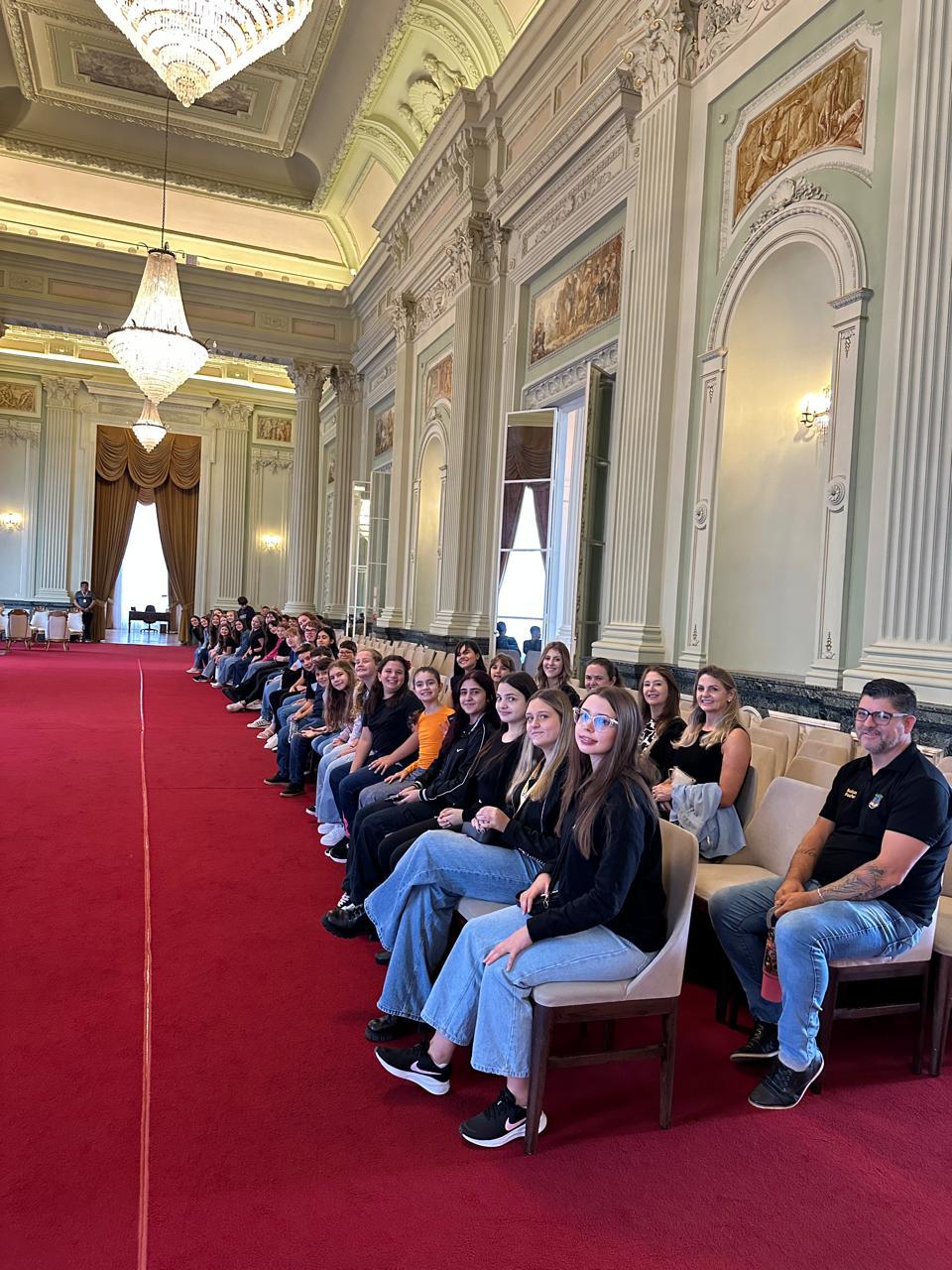 A viagem também incluiu momentos de integração cultural e institucional. Aproveitando a ida a Porto Alegre, os integrantes visitaram o Palácio Piratini e a Praça da Matriz durante a manhã, antes da apresentação realizada à tarde no evento comemorativo.