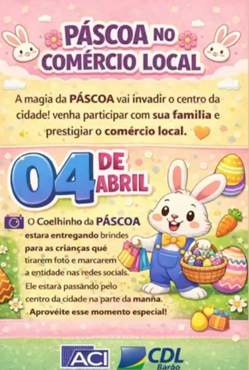 Neste sábado, 4 de abril, o centro de Barão recebe uma ação de Páscoa organizada pela ACI/CDL que leva movimento às ruas e aproxima famílias do comércio local. Durante a manhã, o...