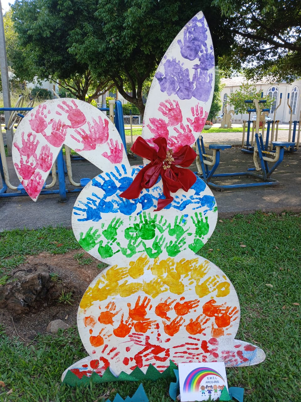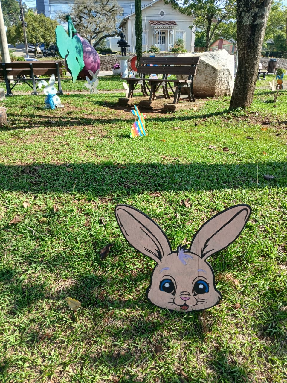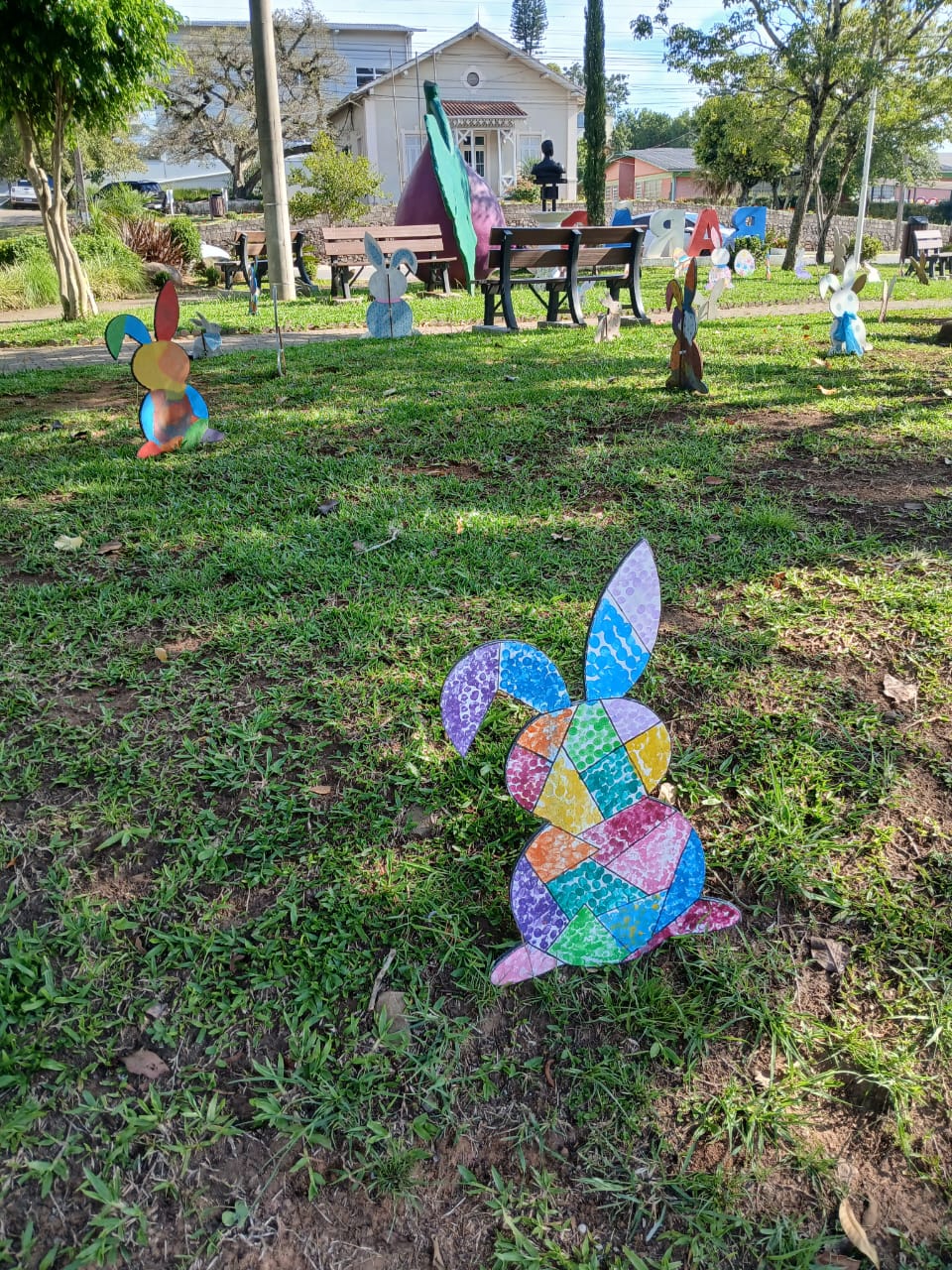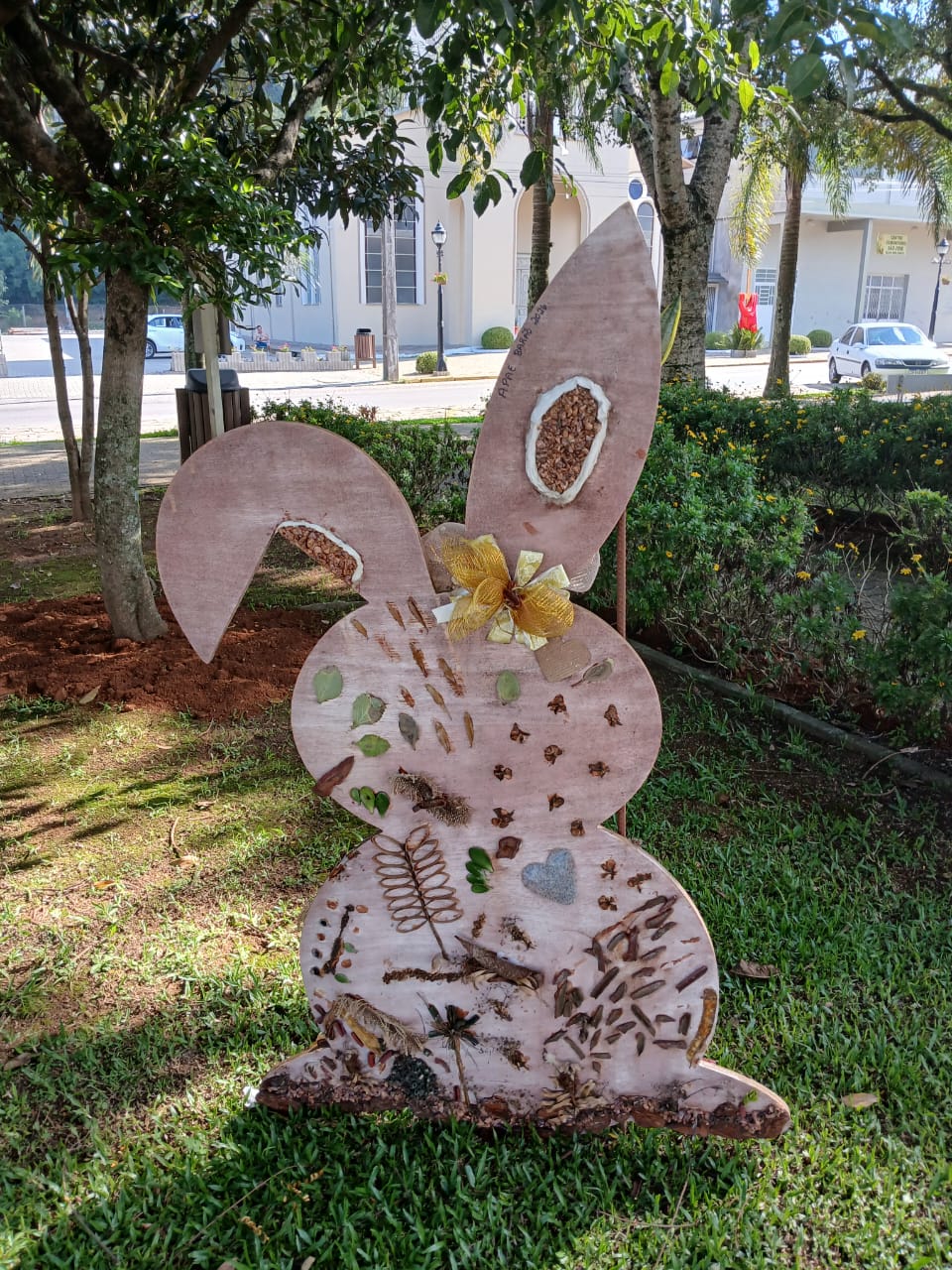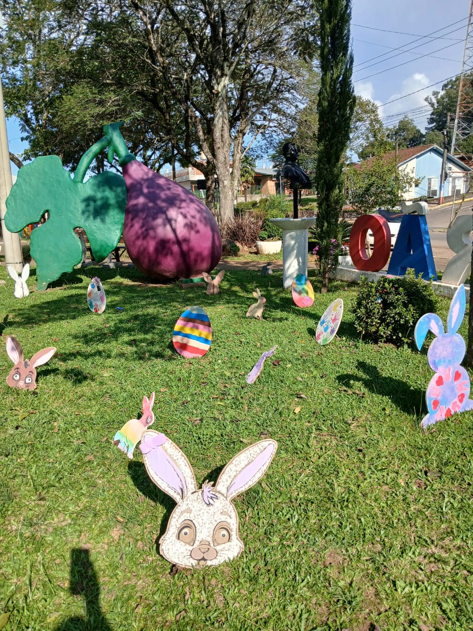 Ao mesmo tempo, a cidade apresenta um cenário que chama atenção de quem passa pelas praças Central e dos Símbolos. A decoração de Páscoa, construída pelas escolas municipais, ocupa os espaços públicos com coelhos, ovos e elementos temáticos produzidos a partir de diferentes materiais. Cada peça revela o envolvimento das crianças e o trabalho conjunto com as equipes diretivas, em uma composição que valoriza a criatividade e o cuidado estético.