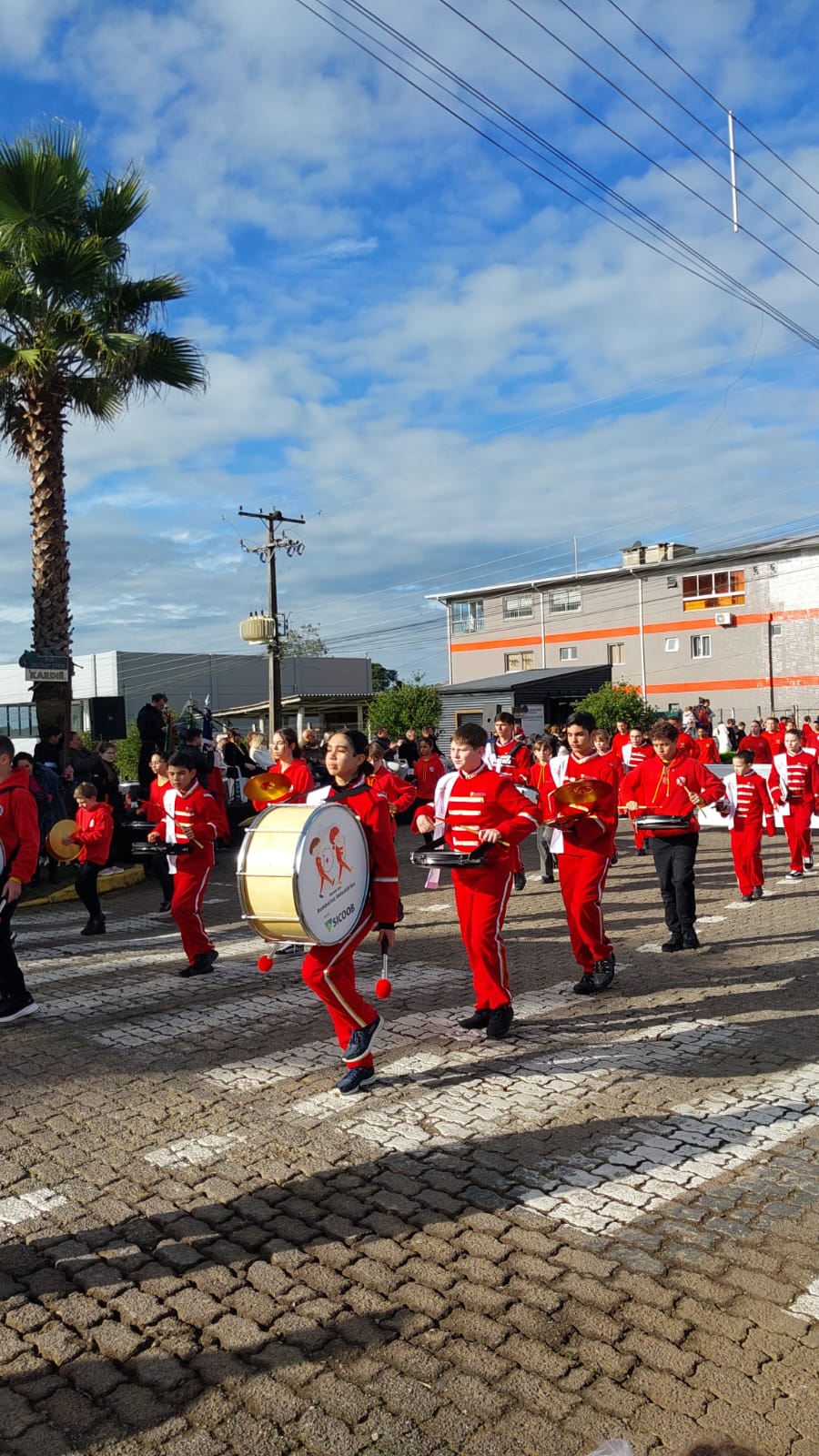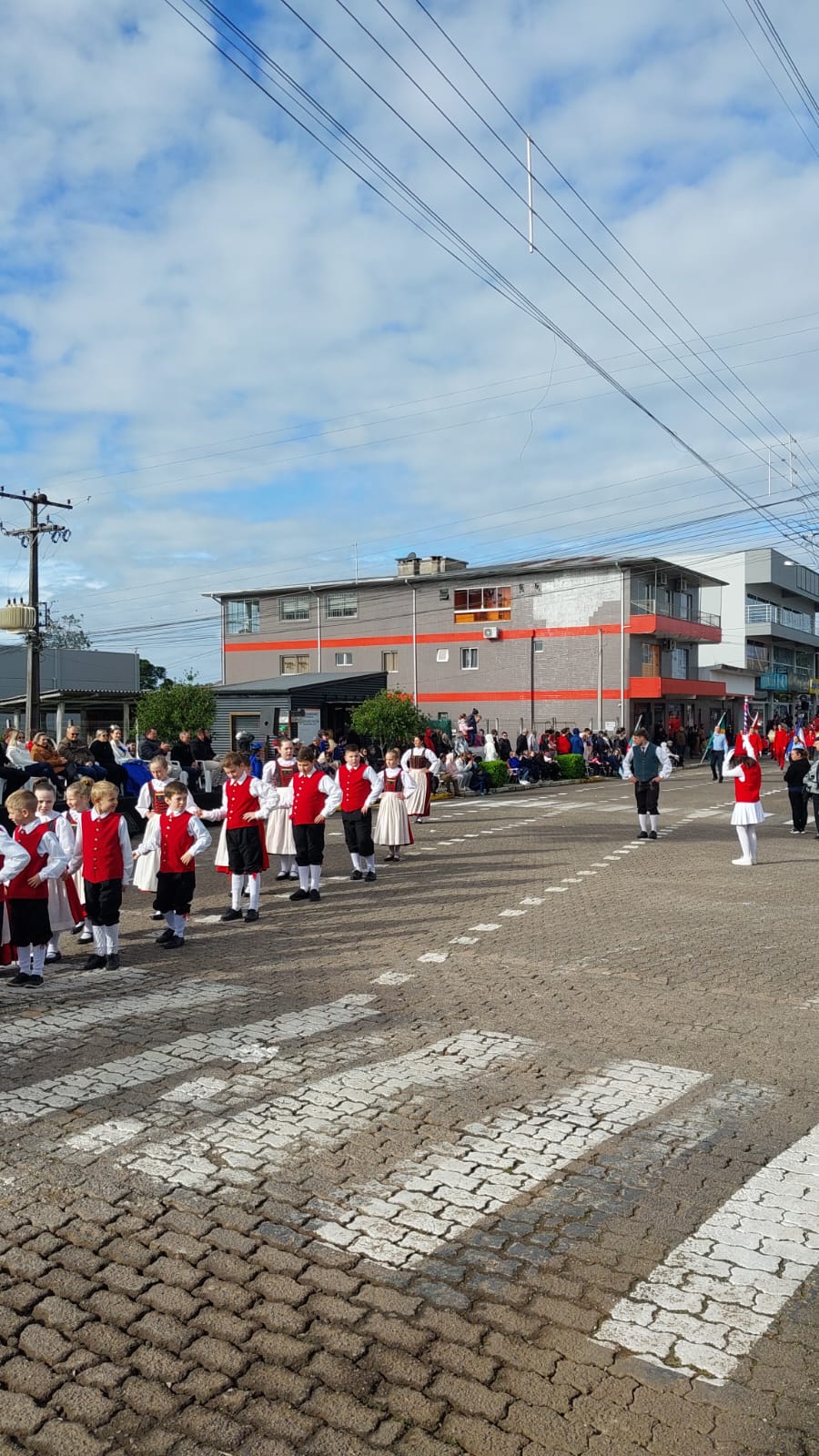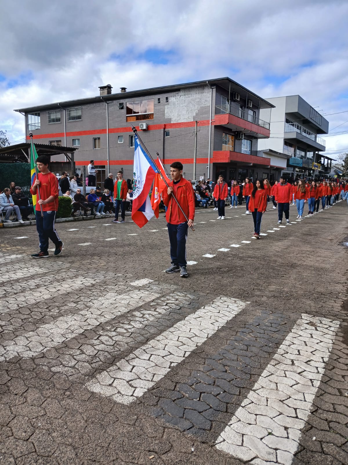 Na sequência, desfilaram as escolas José Emílio Poersch, Nicolau Bourscheid e Cônego Caspary, além da APAE e do Centro Municipal de Oficinas Prof. Renati. O desfile seguiu com a Orquestra Municipal, o Grupo Instrumental, o Coral Infanto-Juvenil e a Escola São Roque, acompanhados de entidades como Emater, Talian e Studio Inovare.