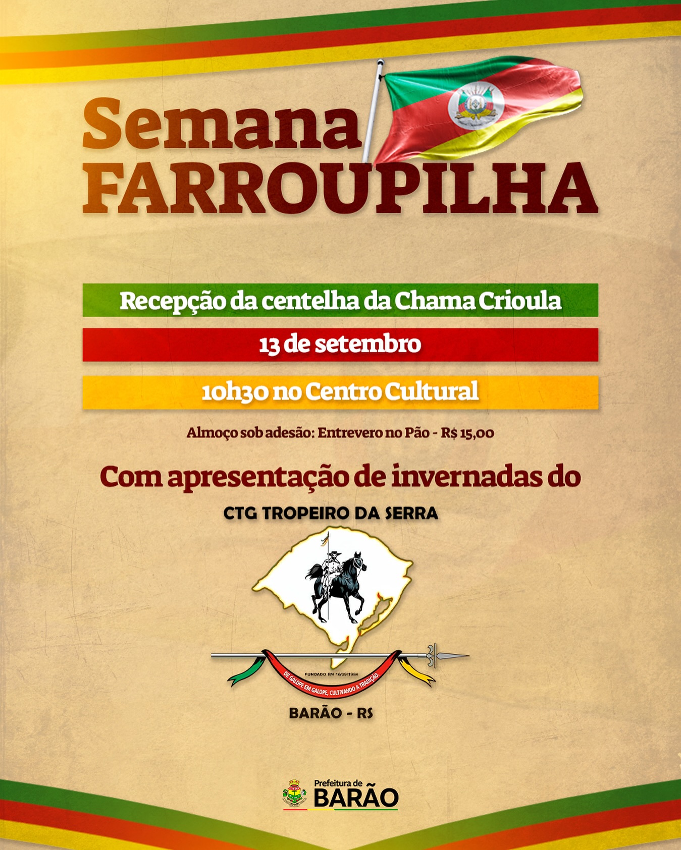 A programação inclui apresentações artísticas das invernadas do CTG Tropeiro da Serra, celebrando a tradição gaúcha com música e dança.