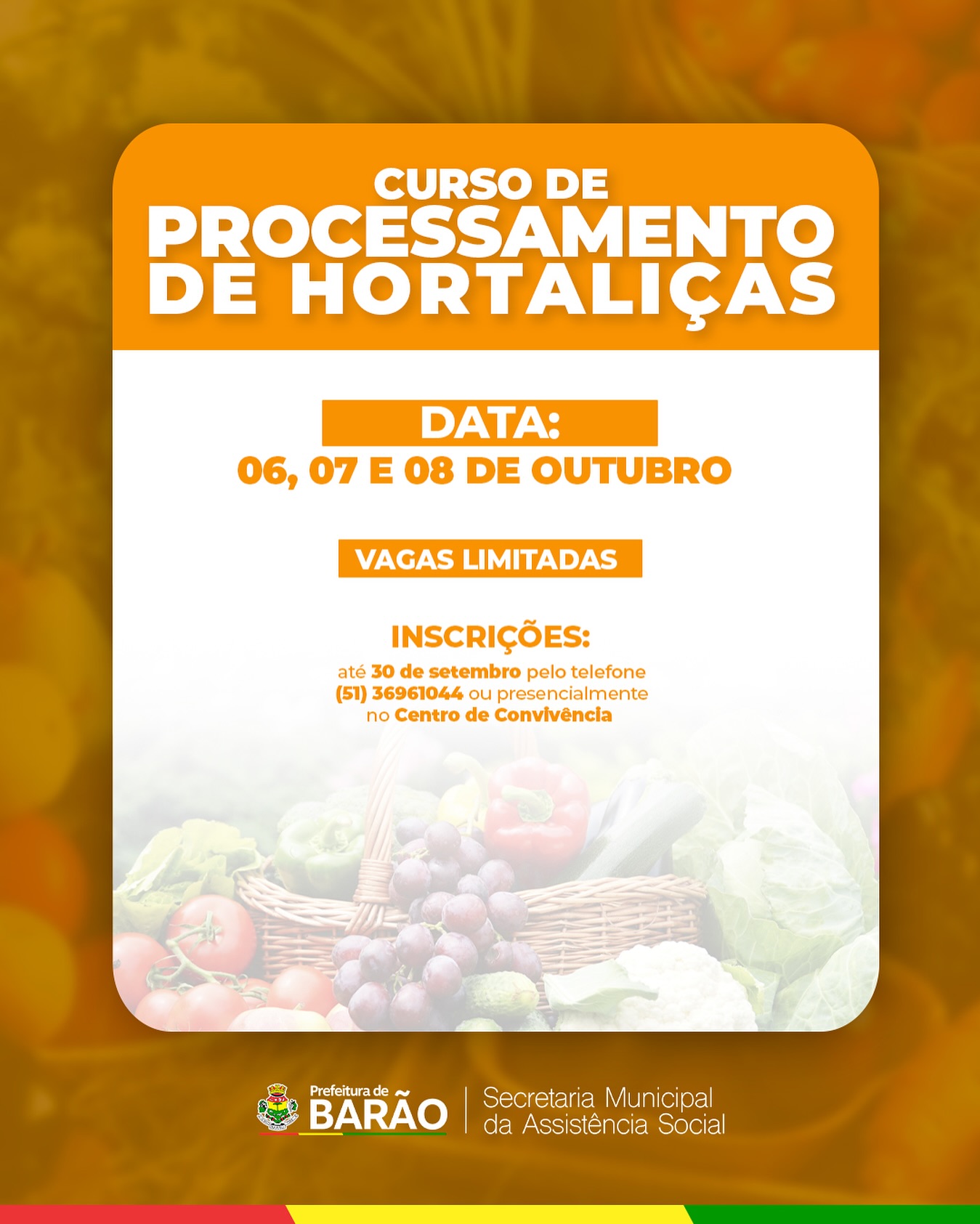 A Prefeitura de Barão, por meio da Secretaria Municipal da Assistência Social, promoverá nos dias 06, 07 e 08 de outubro um Curso de Processamento de Hortaliças, voltado à comunidade local.