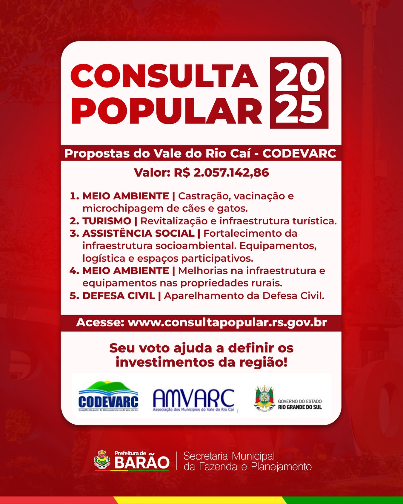 Entre os dias 6 e 10 de outubro, estará aberta a Consulta Popular 2025, processo que permite aos cidadãos gaúchos definir onde serão aplicados os recursos do Governo do Estado. O valor total destinado é de R$ 2.057.142,86, e a votação pode ser feita pelo site www.consultapopular.rs.gov.br.