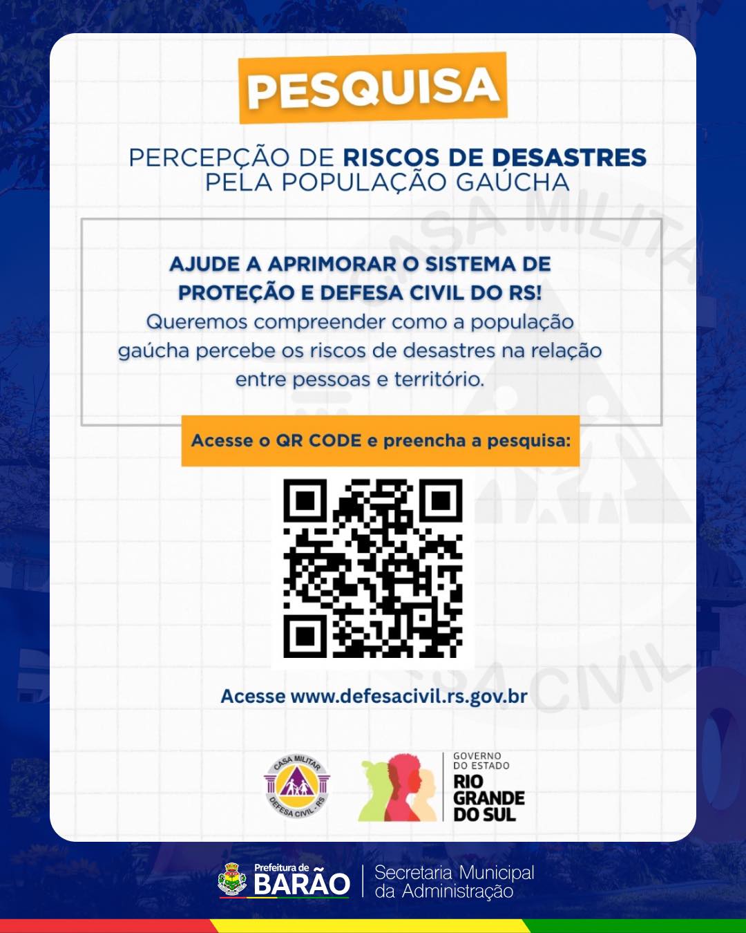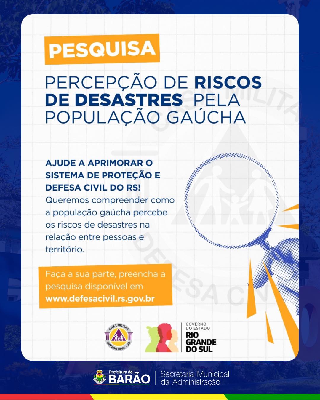 A Defesa Civil do Rio Grande do Sul está realizando a pesquisa “Percepção de Riscos de Desastres pela População Gaúcha”.