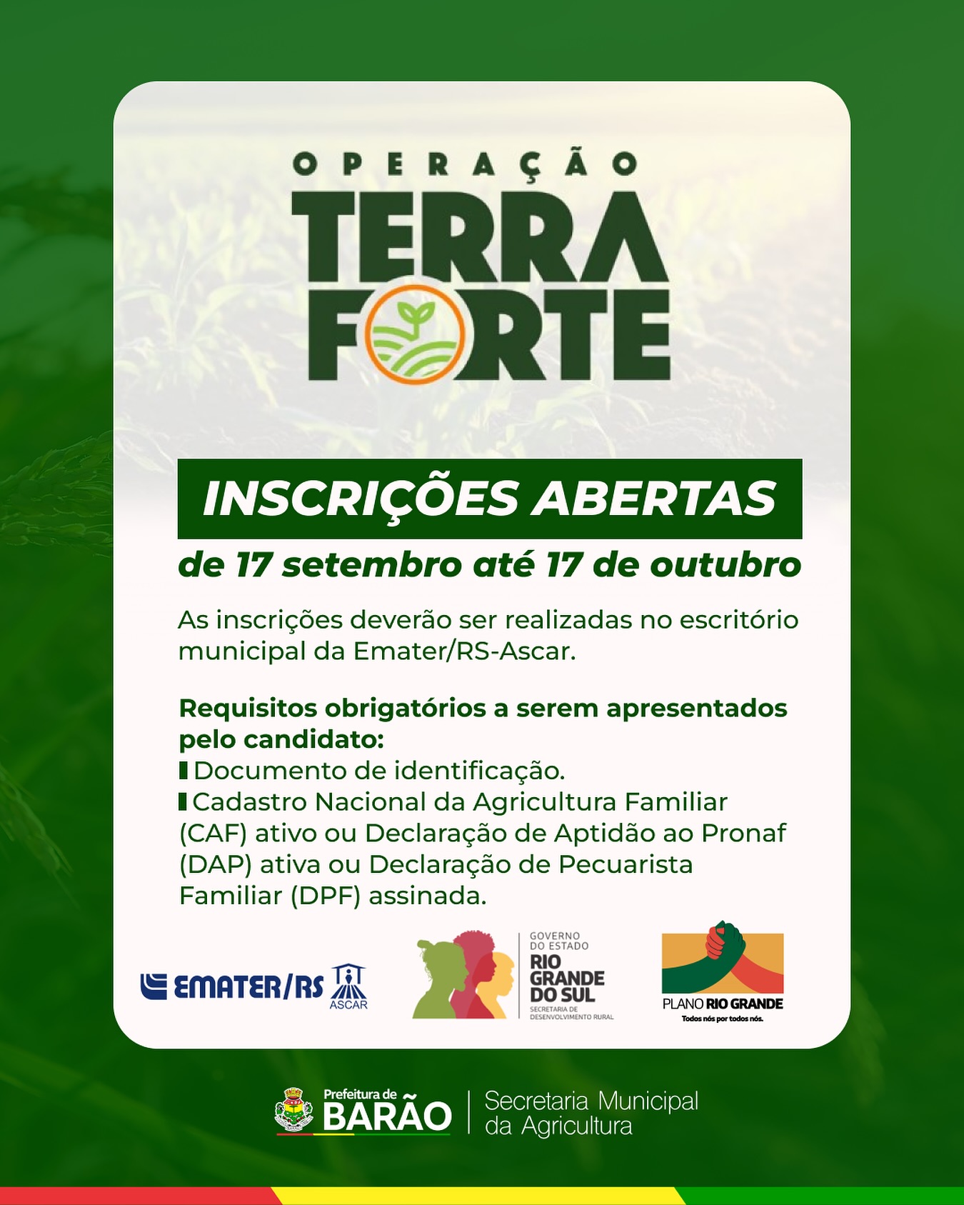Estão abertas, até o dia 17 de outubro, as inscrições para a Operação Terra Forte, iniciativa voltada ao fortalecimento da agricultura familiar. Os interessados devem realizar a inscrição diretamente no escritório municipal da Emater/RS-Ascar, em Barão.