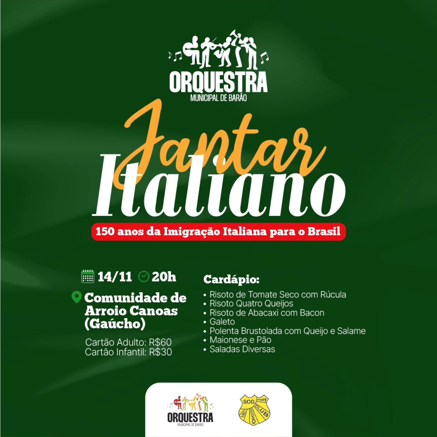 Uma noite especial está sendo preparada para celebrar os 150 anos da Imigração Italiana no Brasil! No dia 14 de novembro, a Orquestra Municipal de Barão promove o Jantar Italiano, um evento repleto de cultura, tradição e boa música, que promete encantar o público.