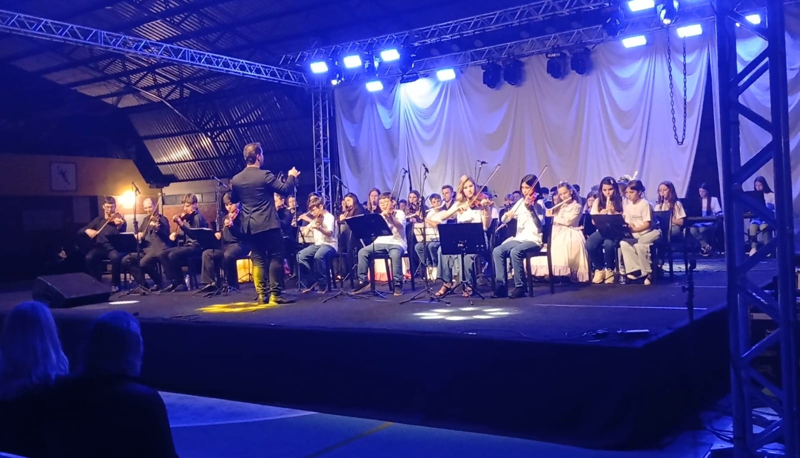 A noite seguiu com a energia tradicionalista do CTG Tropeiro da Serra, representando com orgulho a cultura gaúcha. Encerrando a programação, a Orquestra e o Grupo Instrumental de Barão proporcionaram um grandioso fechamento, unindo talento, emoção e harmonia.