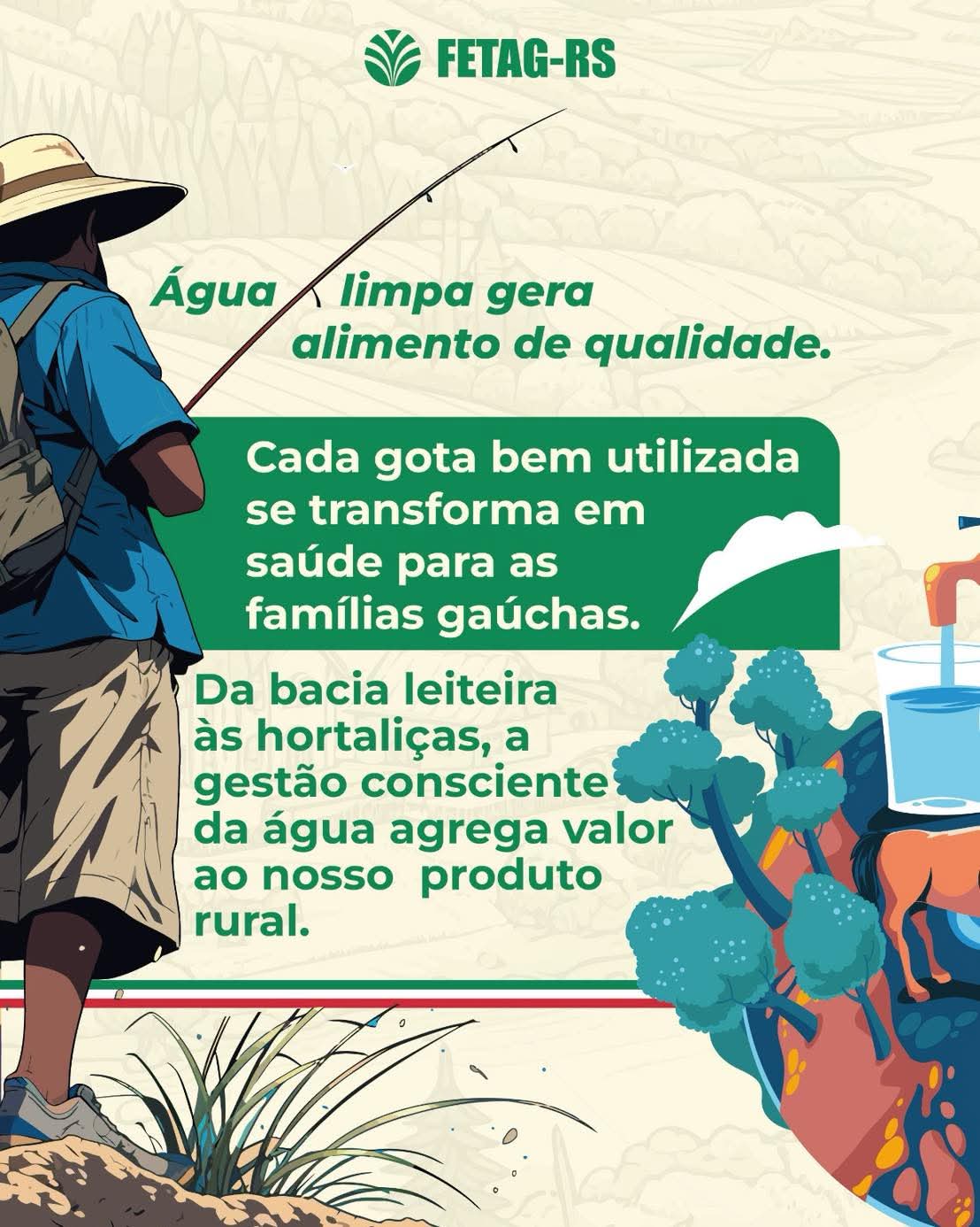 A Federação dos Trabalhadores na Agricultura do Rio Grande do Sul (Fetag-RS) divulgou uma série de peças alusivas ao Dia Mundial da Água, celebrado em 22 de março, com foco na importância da água para a produção agropecuária e a sustentabilidade no meio rural.