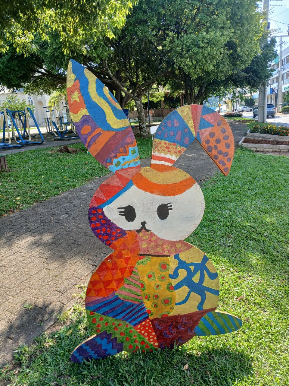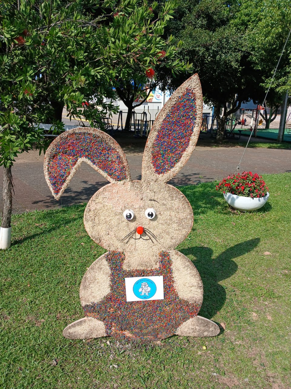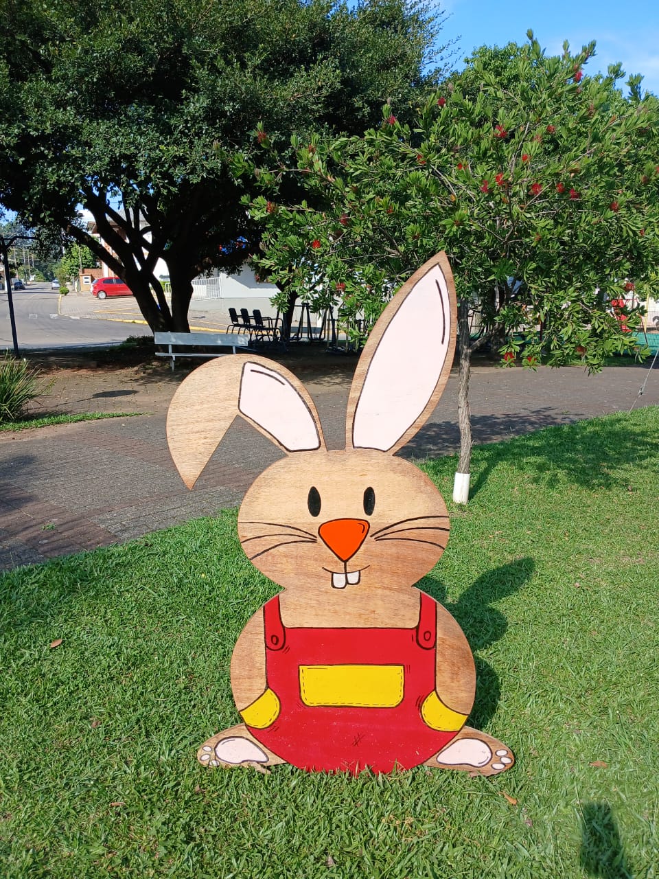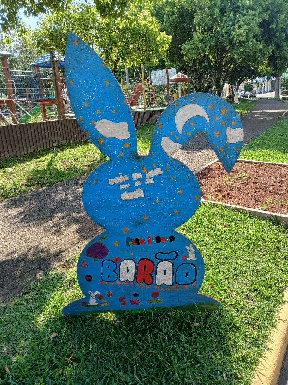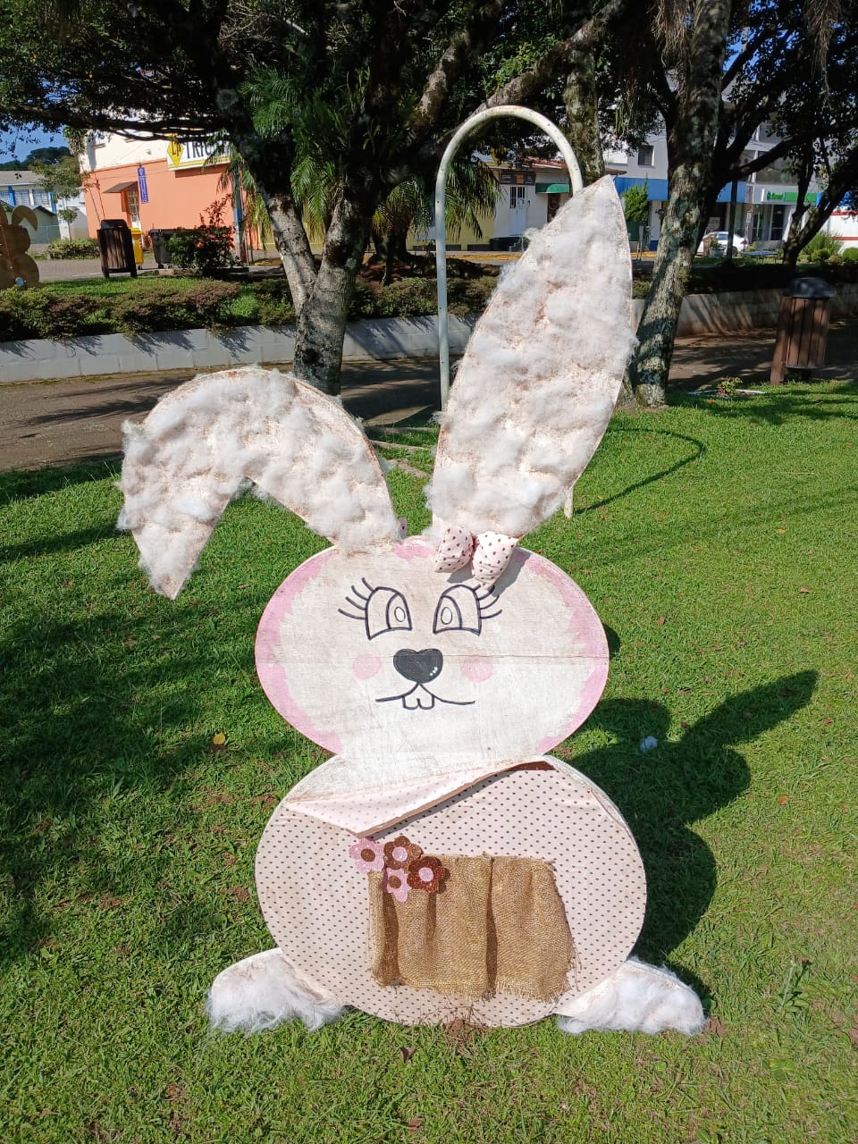 Ao mesmo tempo, a cidade apresenta um cenário que chama atenção de quem passa pelas praças Central e dos Símbolos. A decoração de Páscoa, construída pelas escolas municipais, ocupa os espaços públicos com coelhos, ovos e elementos temáticos produzidos a partir de diferentes materiais. Cada peça revela o envolvimento das crianças e o trabalho conjunto com as equipes diretivas, em uma composição que valoriza a criatividade e o cuidado estético.
