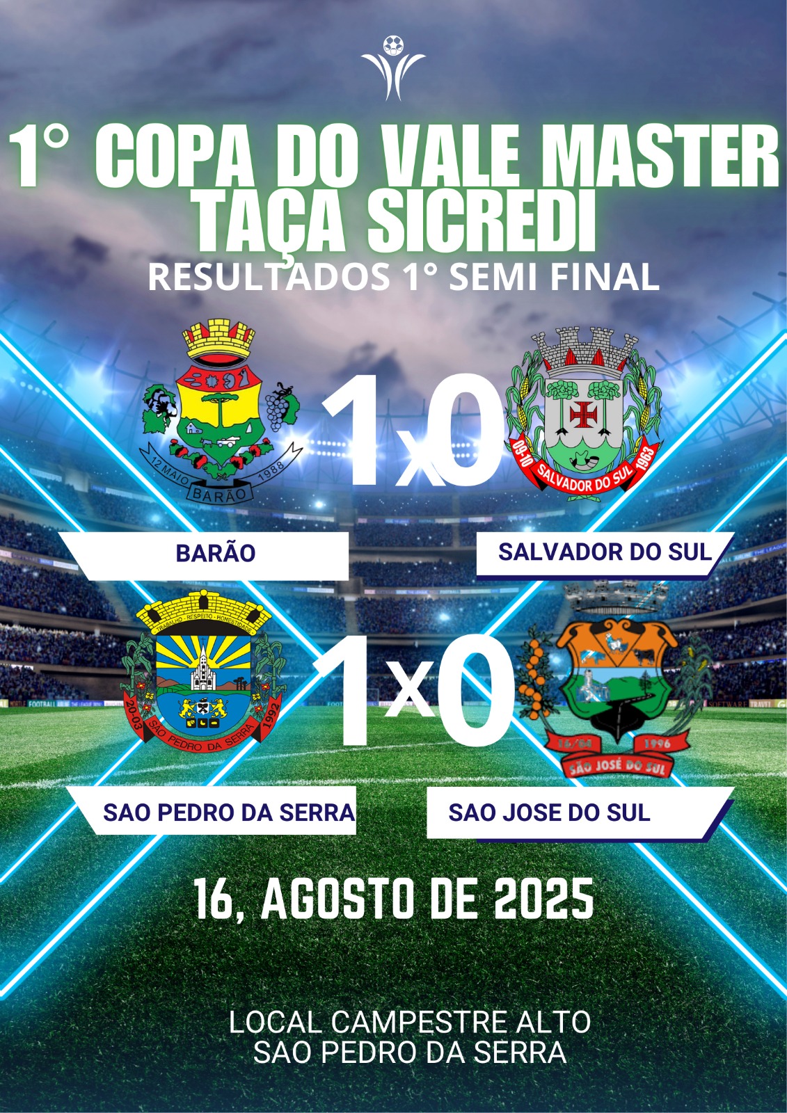 No primeiro duelo, o Barão venceu o Salvador do Sul por 1 a 0, garantindo a primeira vaga na grande decisão. Já na sequência, a equipe de São Pedro da Serra também avançou ao derrotar o São José do Sul pelo mesmo placar: 1 a 0.