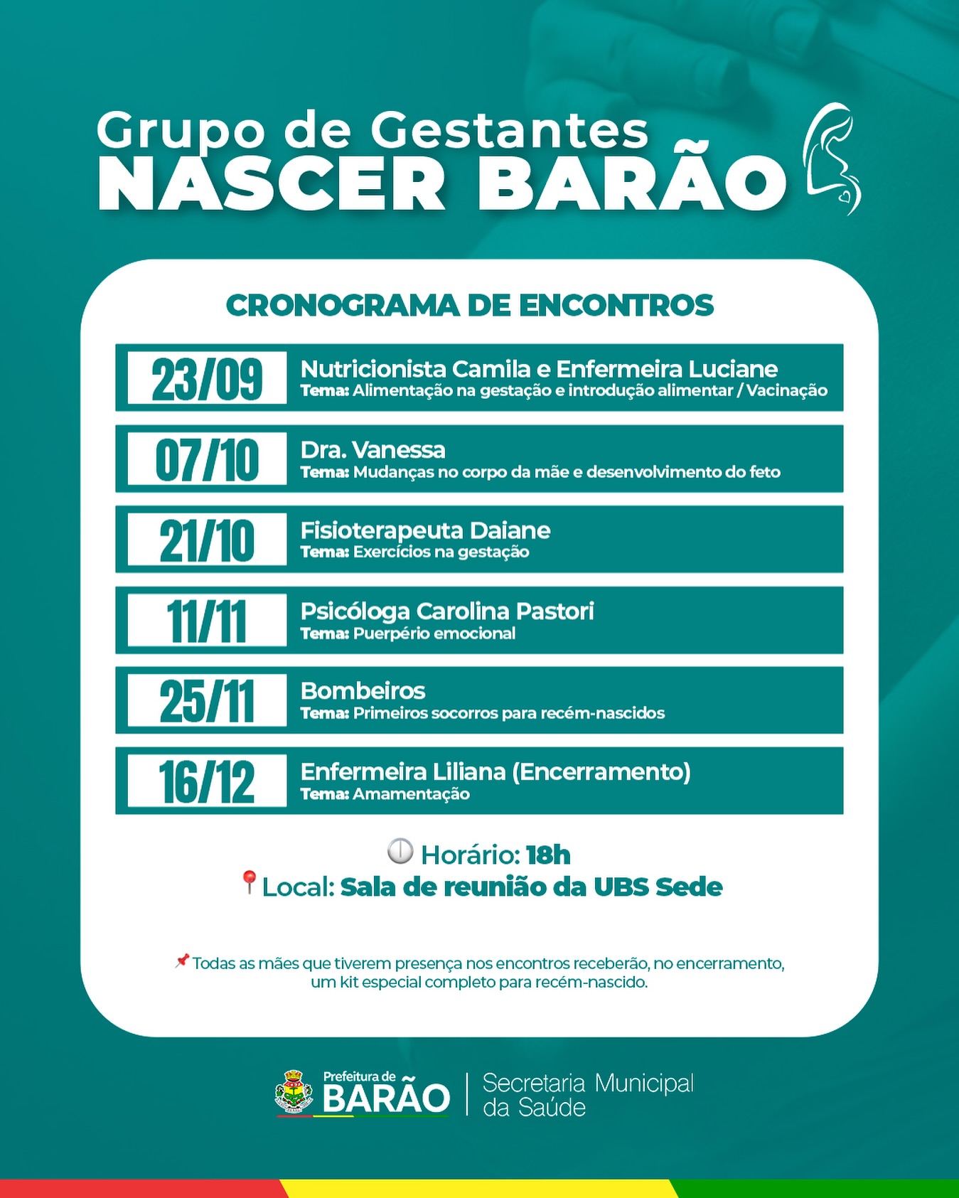 Os encontros são gratuitos e têm como objetivo promover informações relevantes, tirar dúvidas e fortalecer o cuidado com a saúde materna e infantil.
