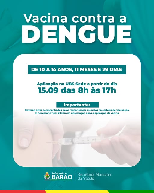 A Prefeitura de Barão, por meio da Secretaria Municipal da Saúde, inicia no dia 15 de setembro a vacinação contra a dengue para crianças e adolescentes de 10 a 14 anos, 11 meses e 29 dias. A aplicação será realizada na UBS Sede, das 8h às 17h.