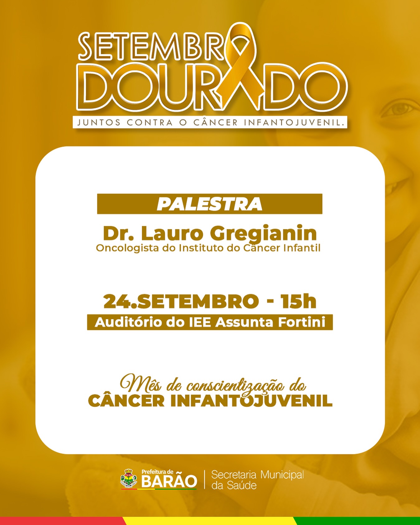 Como parte das ações do Setembro Dourado, mês de conscientização sobre o câncer infantojuvenil, a Secretaria Municipal da Saúde de Barão promove uma palestra com o oncologista Dr. Lauro Gregianin, do Instituto do Câncer Infantil.